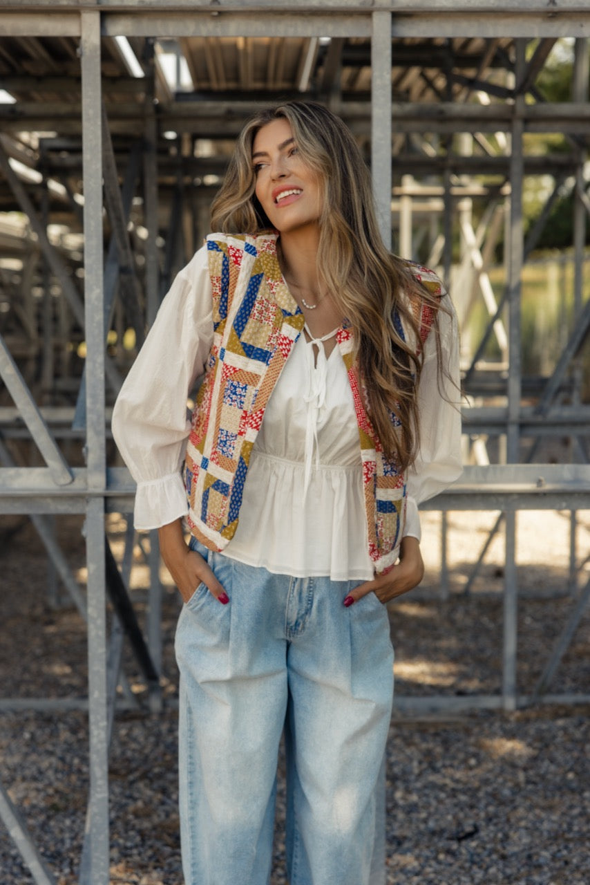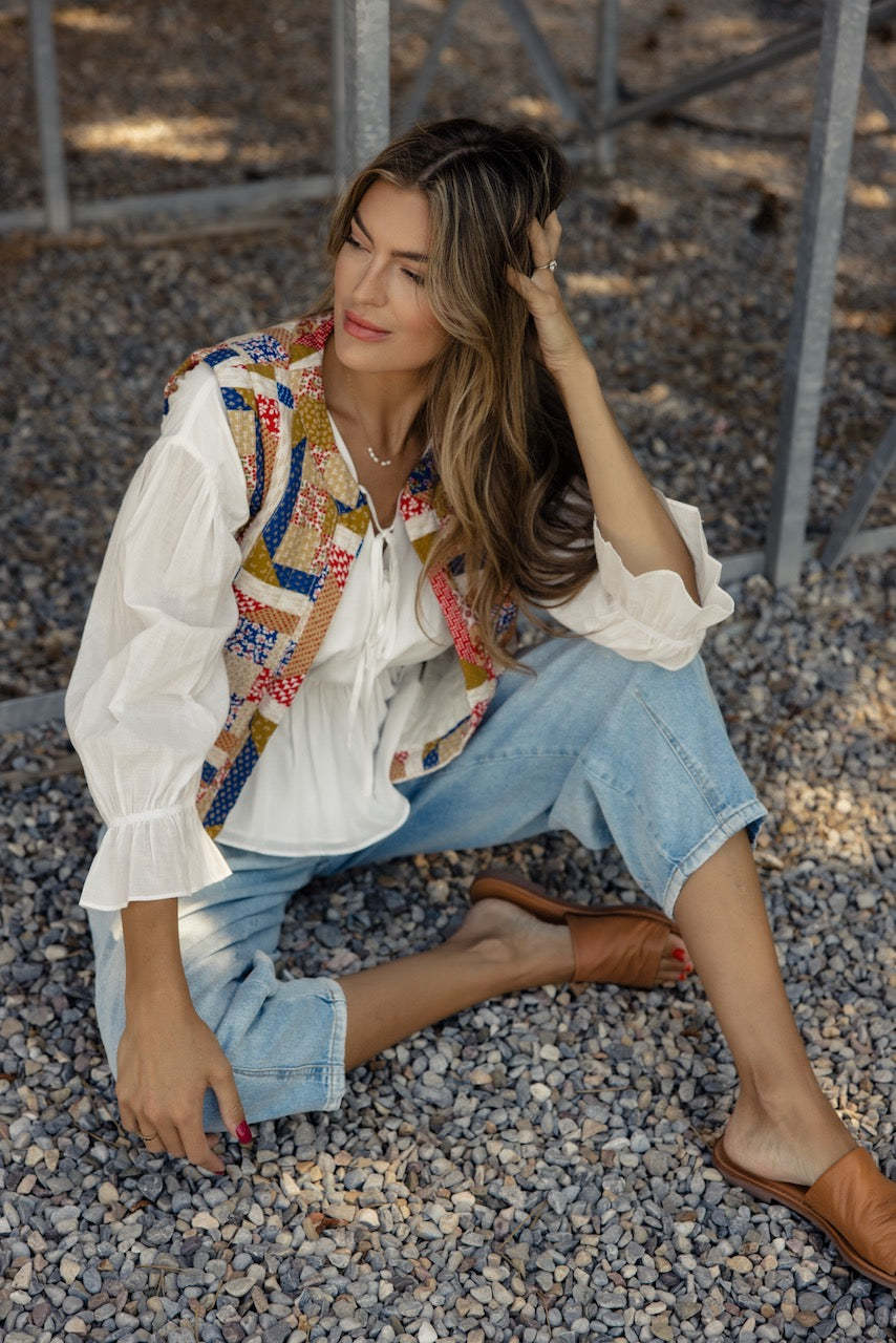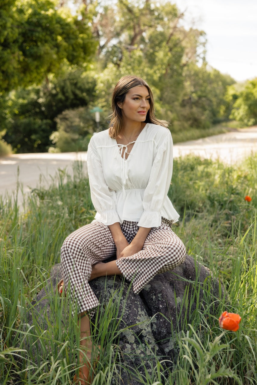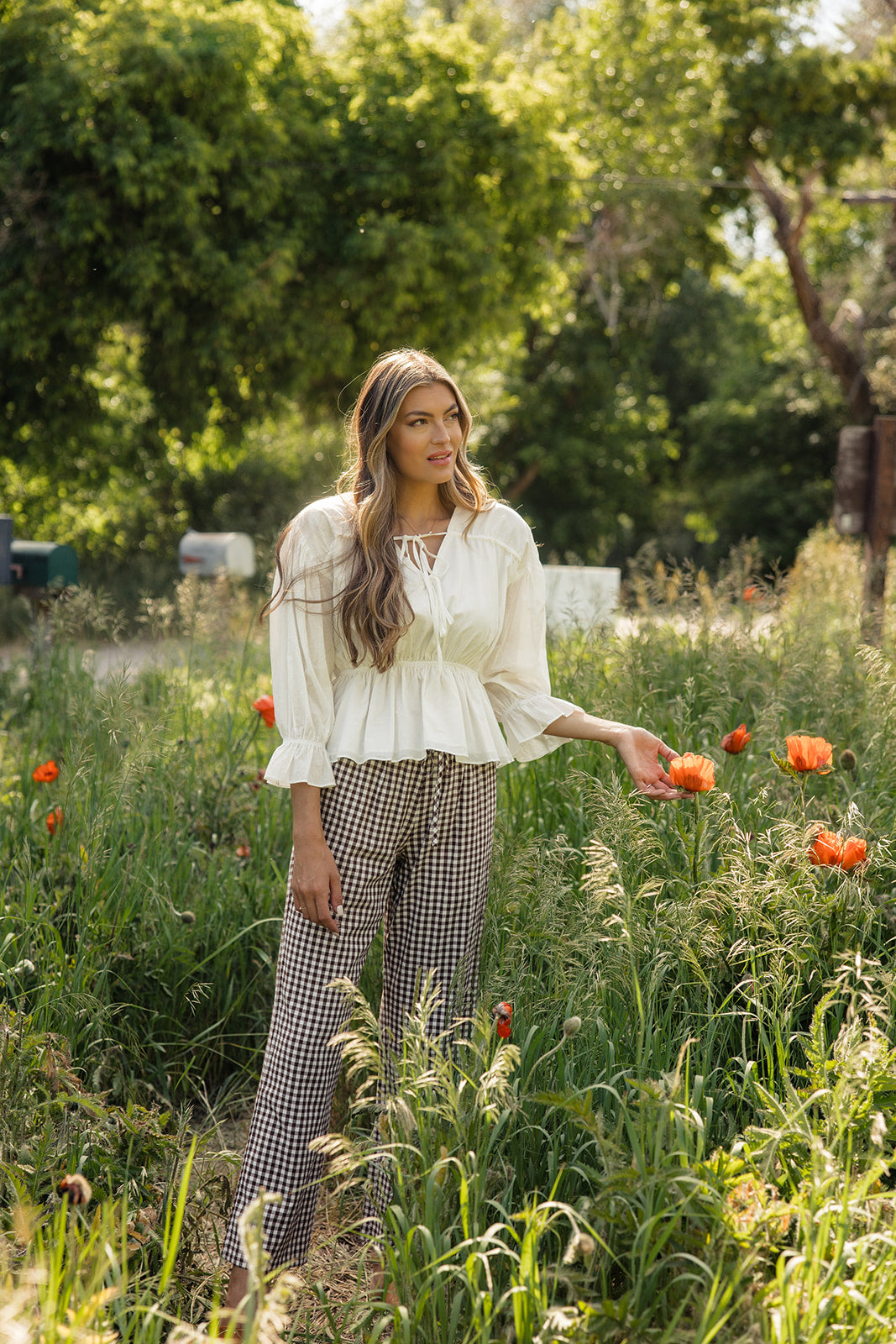 Get ready because this one's a true one hit wonder! This blouse has everything: an elastic waistband for the perfect fit, a tie front for that extra flair, and a flattering v-neckline to show off your fab style. The billow sleeves add a touch of romance, while the gathered seams give it that wow factor. Trust me, you need this in your wardrobe ASAP!